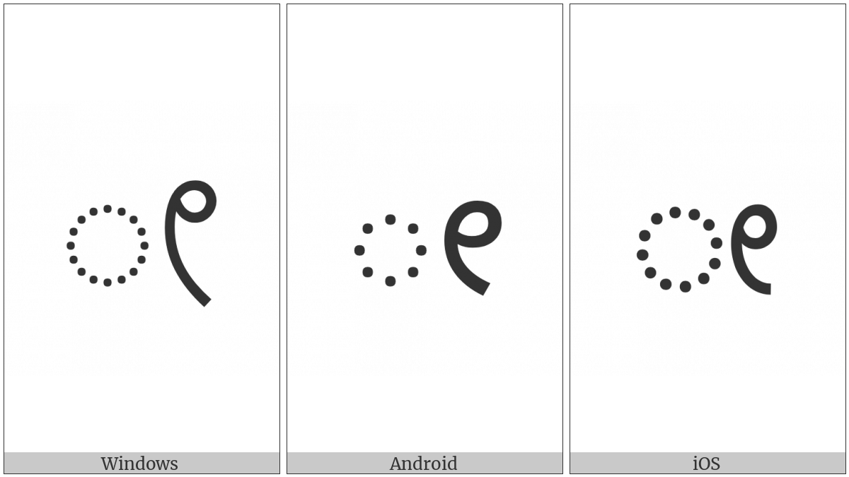 The image below shows how the “Kannada Length Mark” symbol might look like on different operating systems. If the font in which this web site is displayed does not contain the symbol and there is no fallback font able to render it, you can use the image below to get an idea of what it should look like.