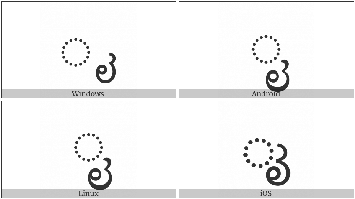 The image below shows how the “Kannada Ai Length Mark” symbol might look like on different operating systems. If the font in which this web site is displayed does not contain the symbol and there is no fallback font able to render it, you can use the image below to get an idea of what it should look like.