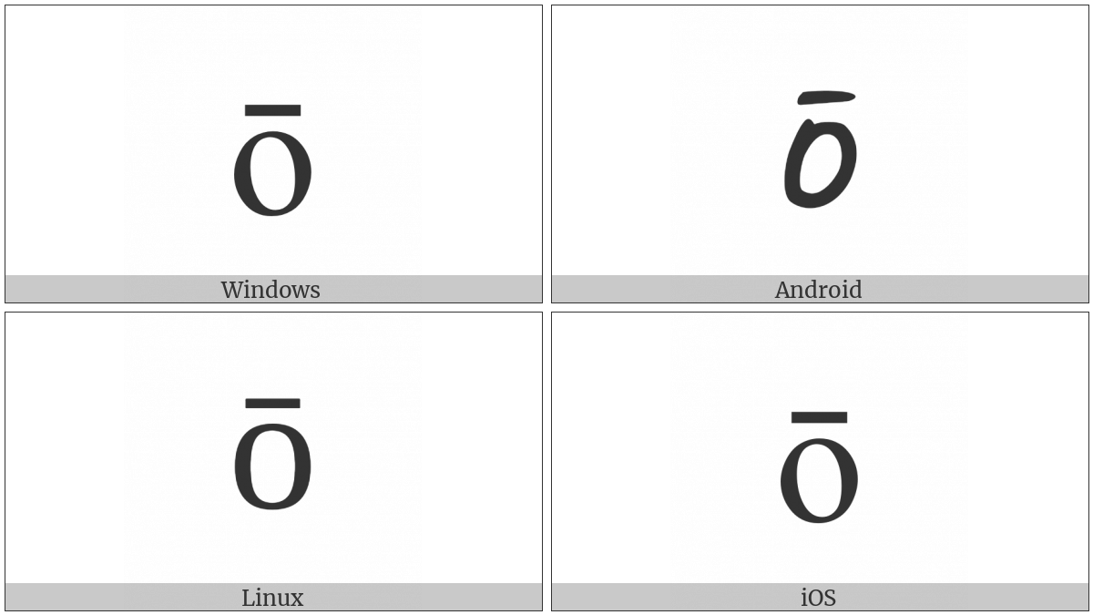 The image below shows how the “Latin Small Letter O With Macron” symbol might look like on different operating systems. If the font in which this web site is displayed does not contain the symbol and there is no fallback font able to render it, you can use the image below to get an idea of what it should look like.