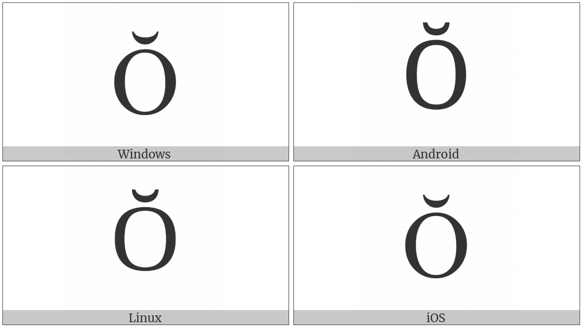 The image below shows how the “Latin Capital Letter O With Breve” symbol might look like on different operating systems. If the font in which this web site is displayed does not contain the symbol and there is no fallback font able to render it, you can use the image below to get an idea of what it should look like.