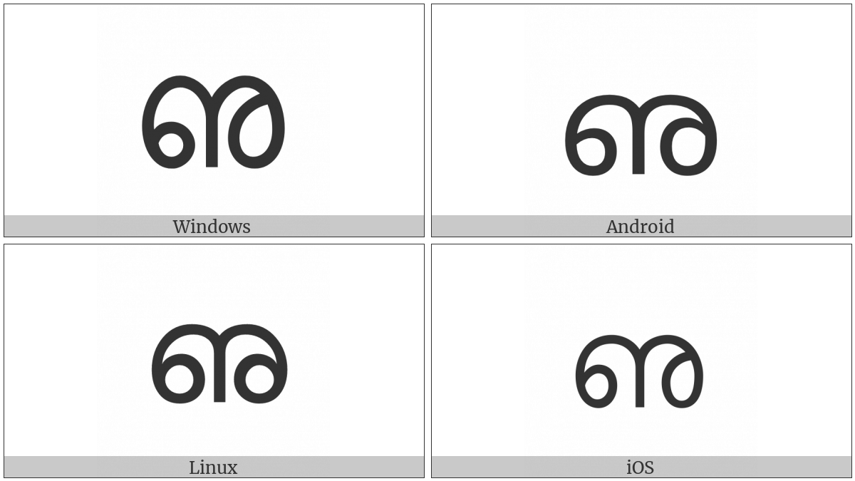 The image below shows how the “Malayalam Letter Vocalic L” symbol might look like on different operating systems. If the font in which this web site is displayed does not contain the symbol and there is no fallback font able to render it, you can use the image below to get an idea of what it should look like.