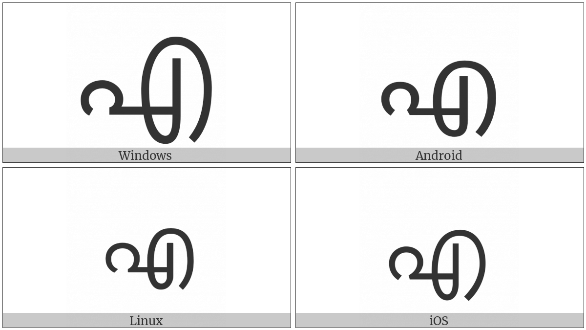 The image below shows how the “Malayalam Letter E” symbol might look like on different operating systems. If the font in which this web site is displayed does not contain the symbol and there is no fallback font able to render it, you can use the image below to get an idea of what it should look like.