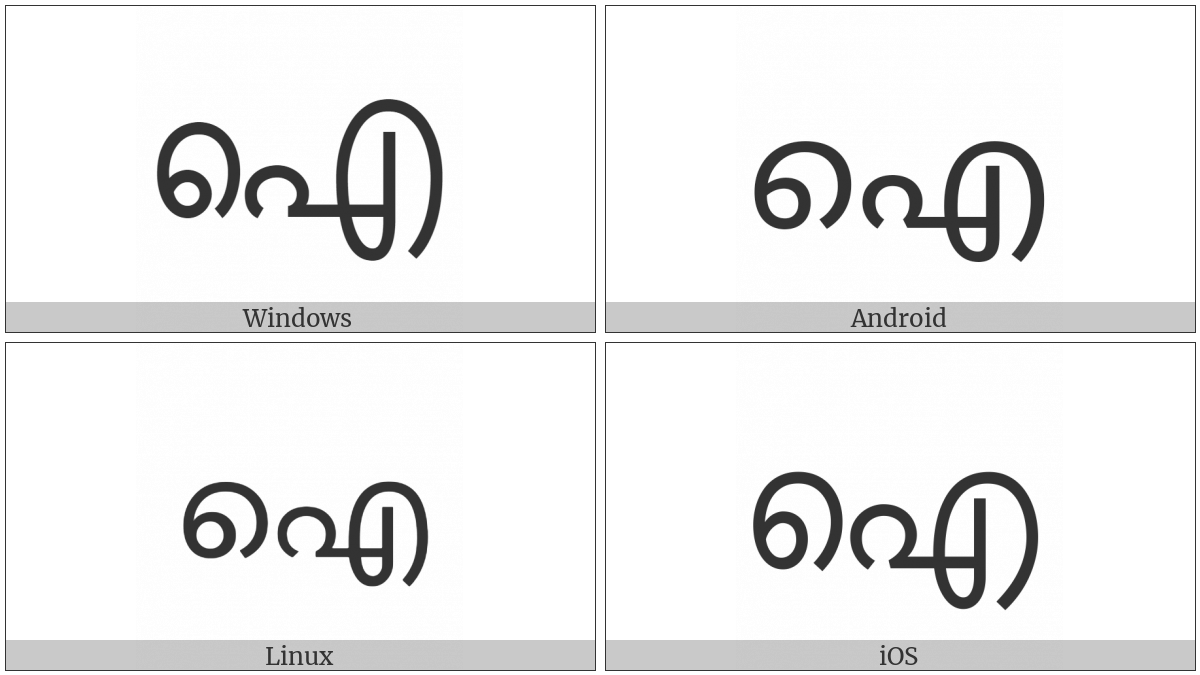 The image below shows how the “Malayalam Letter Ai” symbol might look like on different operating systems. If the font in which this web site is displayed does not contain the symbol and there is no fallback font able to render it, you can use the image below to get an idea of what it should look like.