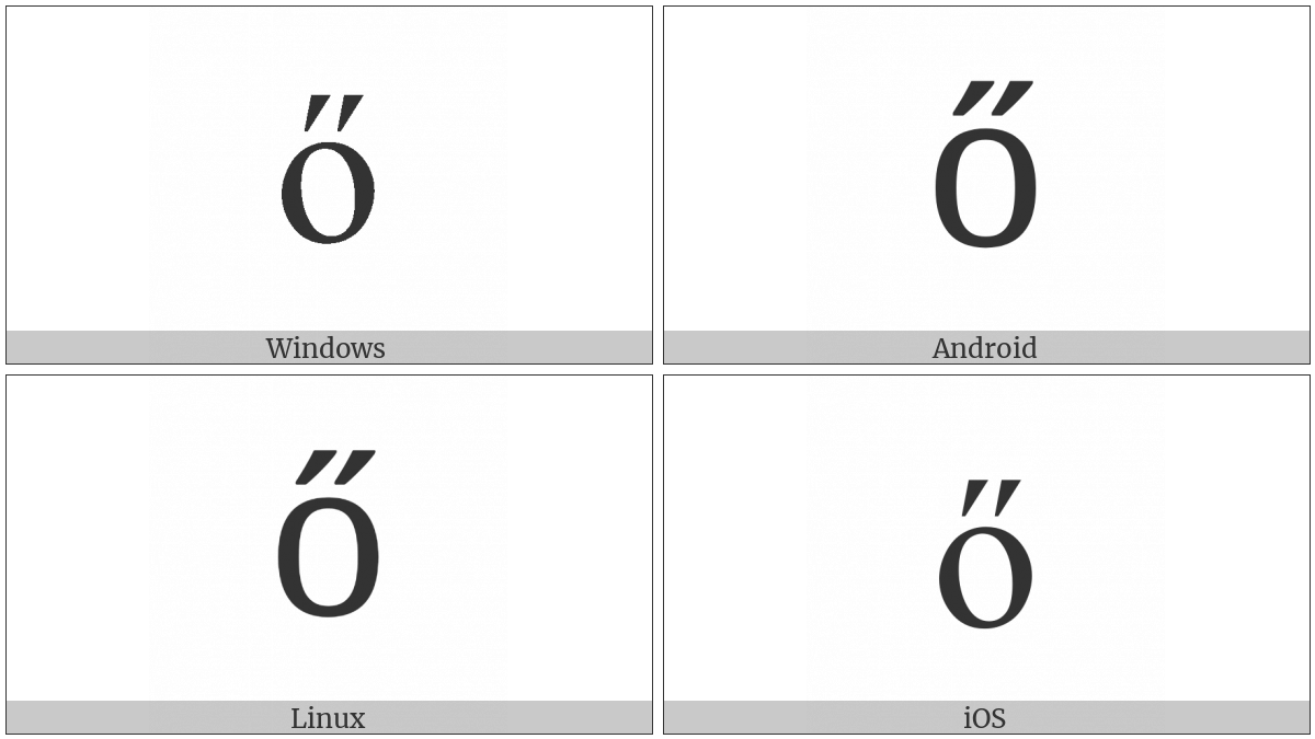 The image below shows how the “Latin Small Letter O With Double Acute” symbol might look like on different operating systems. If the font in which this web site is displayed does not contain the symbol and there is no fallback font able to render it, you can use the image below to get an idea of what it should look like.