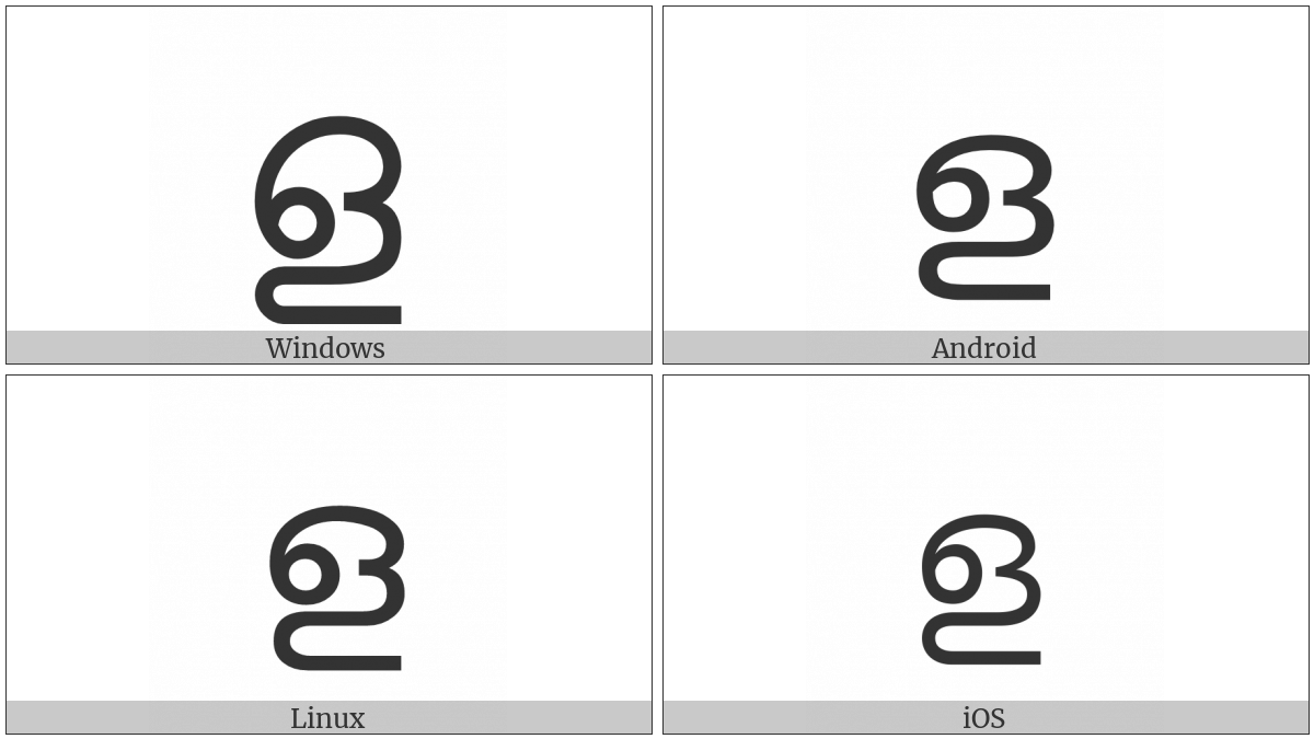 The image below shows how the “Malayalam Letter Lla” symbol might look like on different operating systems. If the font in which this web site is displayed does not contain the symbol and there is no fallback font able to render it, you can use the image below to get an idea of what it should look like.