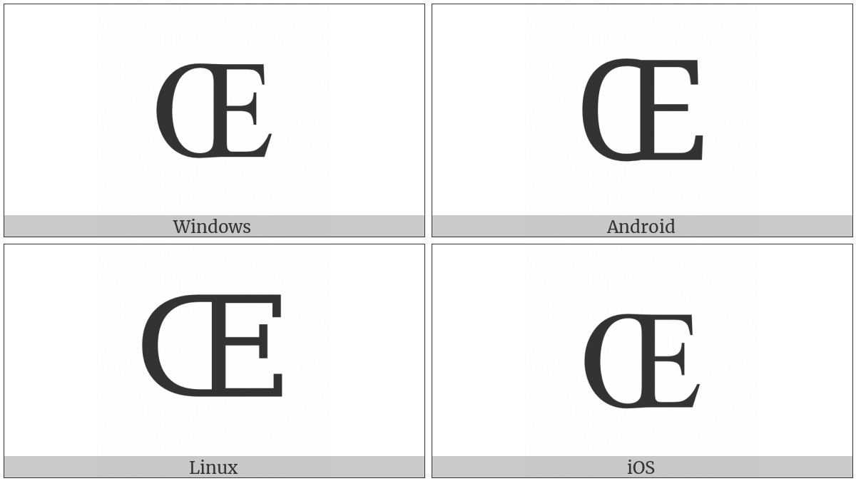 The image below shows how the “Latin Capital Ligature Oe” symbol might look like on different operating systems. If the font in which this web site is displayed does not contain the symbol and there is no fallback font able to render it, you can use the image below to get an idea of what it should look like.