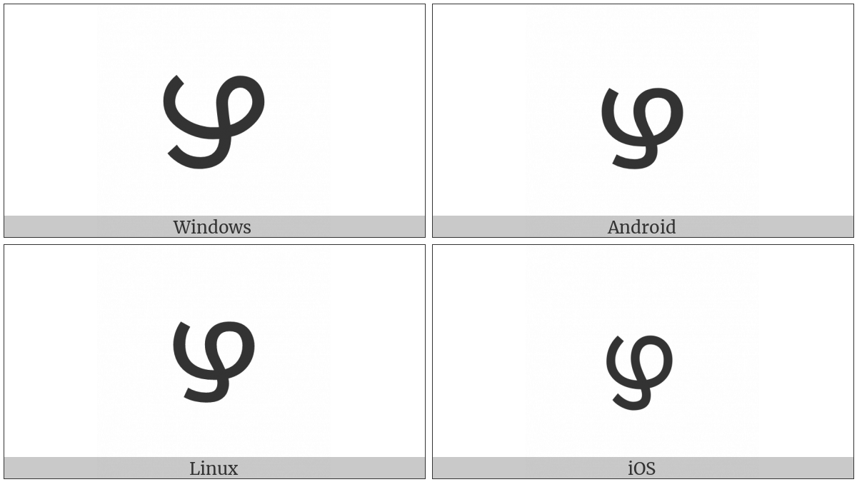 The image below shows how the “Malayalam Letter Llla” symbol might look like on different operating systems. If the font in which this web site is displayed does not contain the symbol and there is no fallback font able to render it, you can use the image below to get an idea of what it should look like.