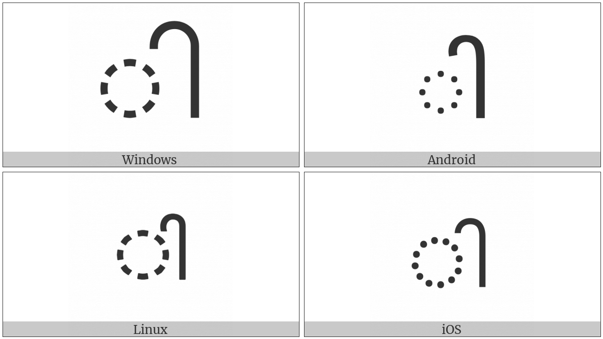 The image below shows how the “Malayalam Vowel Sign I” symbol might look like on different operating systems. If the font in which this web site is displayed does not contain the symbol and there is no fallback font able to render it, you can use the image below to get an idea of what it should look like.