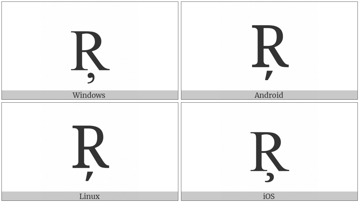 The image below shows how the “Latin Capital Letter R With Cedilla” symbol might look like on different operating systems. If the font in which this web site is displayed does not contain the symbol and there is no fallback font able to render it, you can use the image below to get an idea of what it should look like.
