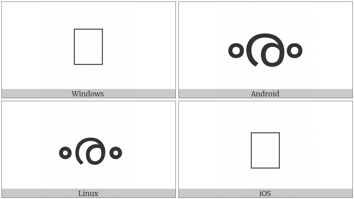 The image below shows how the “Malayalam Letter Archaic Ii” symbol might look like on different operating systems. If the font in which this web site is displayed does not contain the symbol and there is no fallback font able to render it, you can use the image below to get an idea of what it should look like.