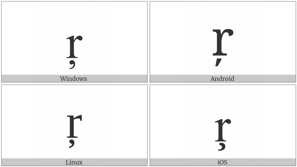 The image below shows how the “Latin Small Letter R With Cedilla” symbol might look like on different operating systems. If the font in which this web site is displayed does not contain the symbol and there is no fallback font able to render it, you can use the image below to get an idea of what it should look like.