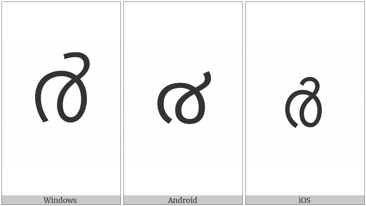 The image below shows how the “Malayalam Digit Four” symbol might look like on different operating systems. If the font in which this web site is displayed does not contain the symbol and there is no fallback font able to render it, you can use the image below to get an idea of what it should look like.
