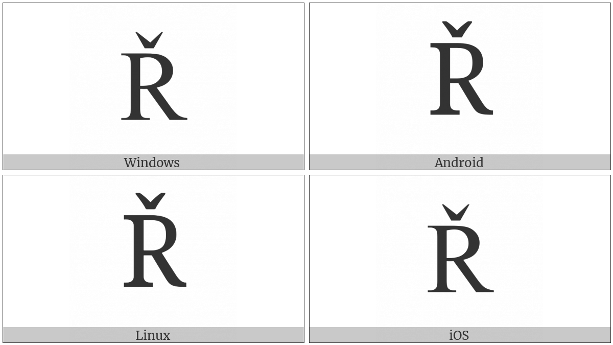 The image below shows how the “Latin Capital Letter R With Caron” symbol might look like on different operating systems. If the font in which this web site is displayed does not contain the symbol and there is no fallback font able to render it, you can use the image below to get an idea of what it should look like.