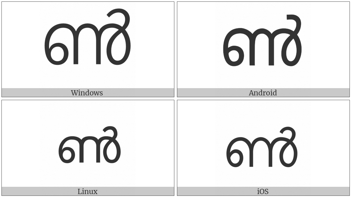 The image below shows how the “Malayalam Letter Chillu Nn” symbol might look like on different operating systems. If the font in which this web site is displayed does not contain the symbol and there is no fallback font able to render it, you can use the image below to get an idea of what it should look like.