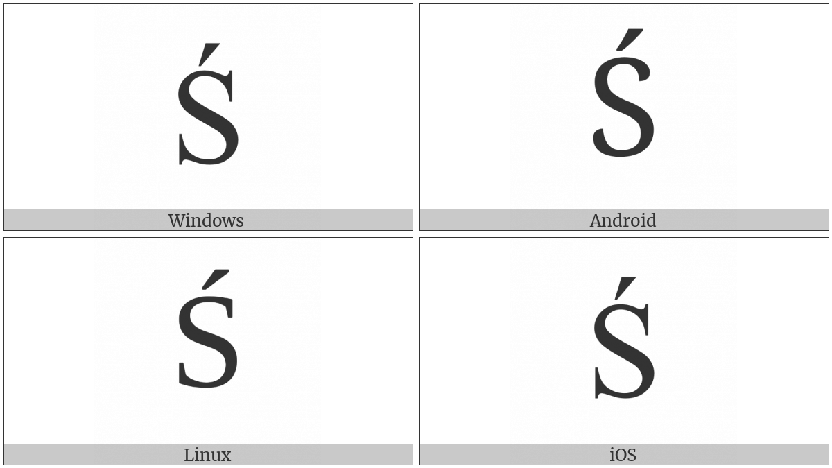 The image below shows how the “Latin Capital Letter S With Acute” symbol might look like on different operating systems. If the font in which this web site is displayed does not contain the symbol and there is no fallback font able to render it, you can use the image below to get an idea of what it should look like.