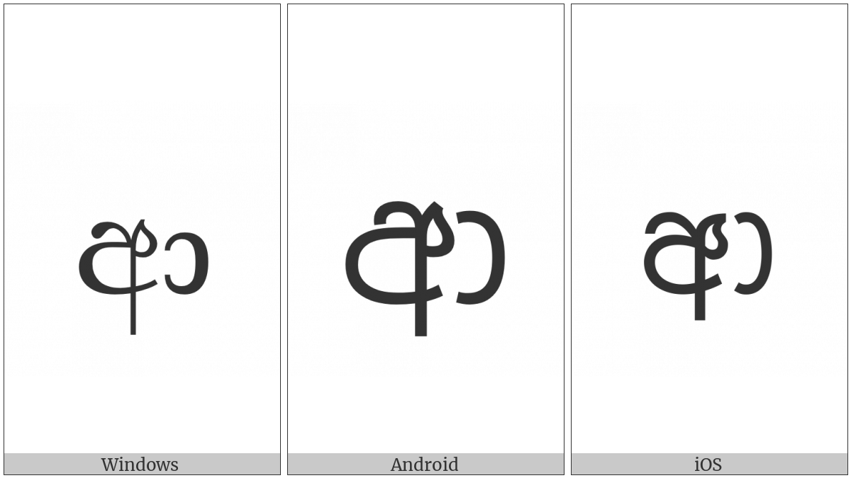 The image below shows how the “Sinhala Letter Aayanna” symbol might look like on different operating systems. If the font in which this web site is displayed does not contain the symbol and there is no fallback font able to render it, you can use the image below to get an idea of what it should look like.
