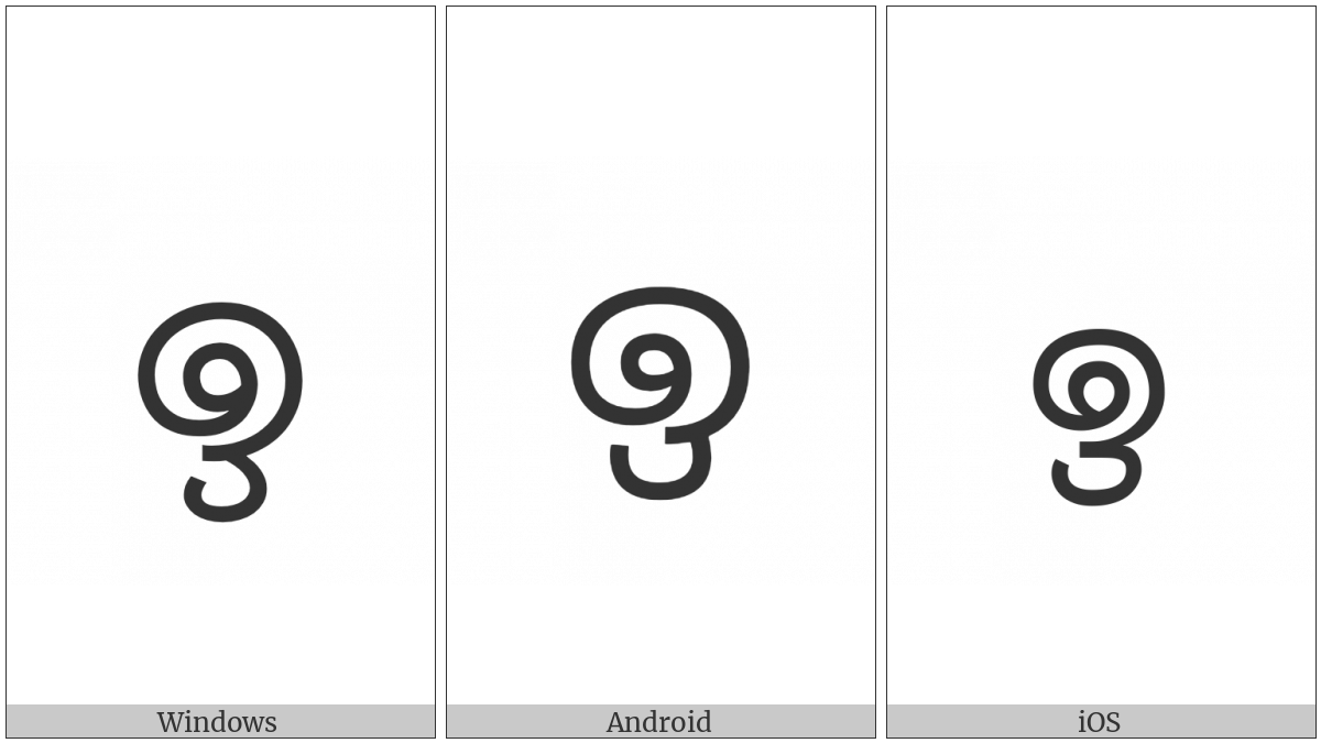 The image below shows how the “Sinhala Letter Iyanna” symbol might look like on different operating systems. If the font in which this web site is displayed does not contain the symbol and there is no fallback font able to render it, you can use the image below to get an idea of what it should look like.