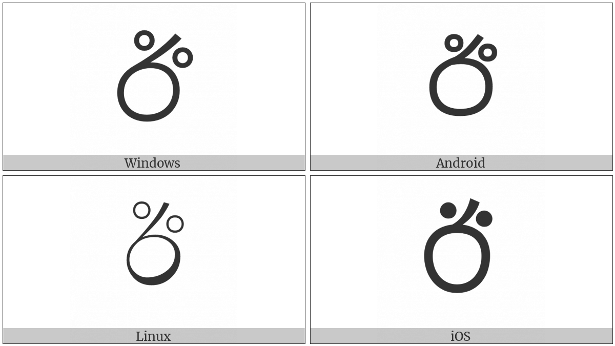 The image below shows how the “Sinhala Letter Iiyanna” symbol might look like on different operating systems. If the font in which this web site is displayed does not contain the symbol and there is no fallback font able to render it, you can use the image below to get an idea of what it should look like.