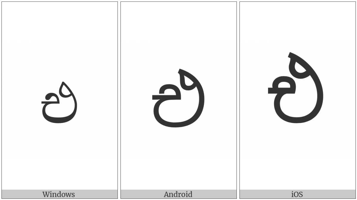 The image below shows how the “Sinhala Letter Eyanna” symbol might look like on different operating systems. If the font in which this web site is displayed does not contain the symbol and there is no fallback font able to render it, you can use the image below to get an idea of what it should look like.