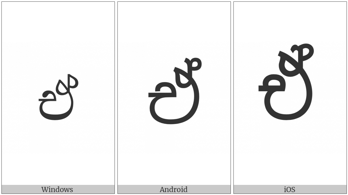 The image below shows how the “Sinhala Letter Eeyanna” symbol might look like on different operating systems. If the font in which this web site is displayed does not contain the symbol and there is no fallback font able to render it, you can use the image below to get an idea of what it should look like.