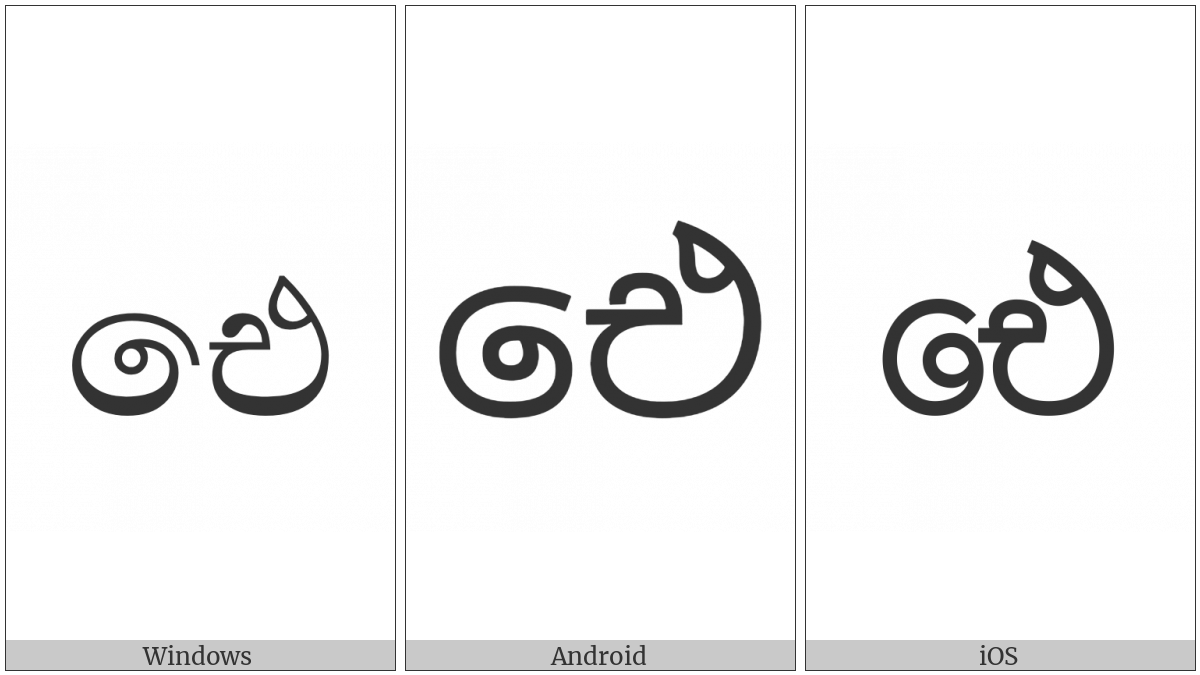 The image below shows how the “Sinhala Letter Aiyanna” symbol might look like on different operating systems. If the font in which this web site is displayed does not contain the symbol and there is no fallback font able to render it, you can use the image below to get an idea of what it should look like.