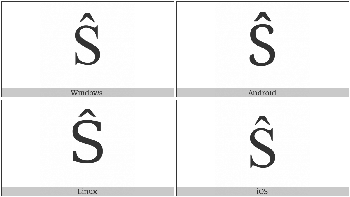 The image below shows how the “Latin Capital Letter S With Circumflex” symbol might look like on different operating systems. If the font in which this web site is displayed does not contain the symbol and there is no fallback font able to render it, you can use the image below to get an idea of what it should look like.