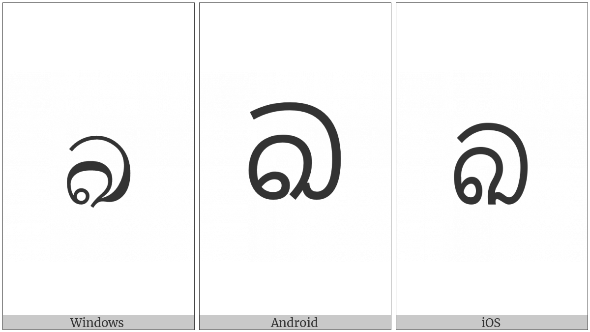 The image below shows how the “Sinhala Letter Mahaapraana Kayanna” symbol might look like on different operating systems. If the font in which this web site is displayed does not contain the symbol and there is no fallback font able to render it, you can use the image below to get an idea of what it should look like.
