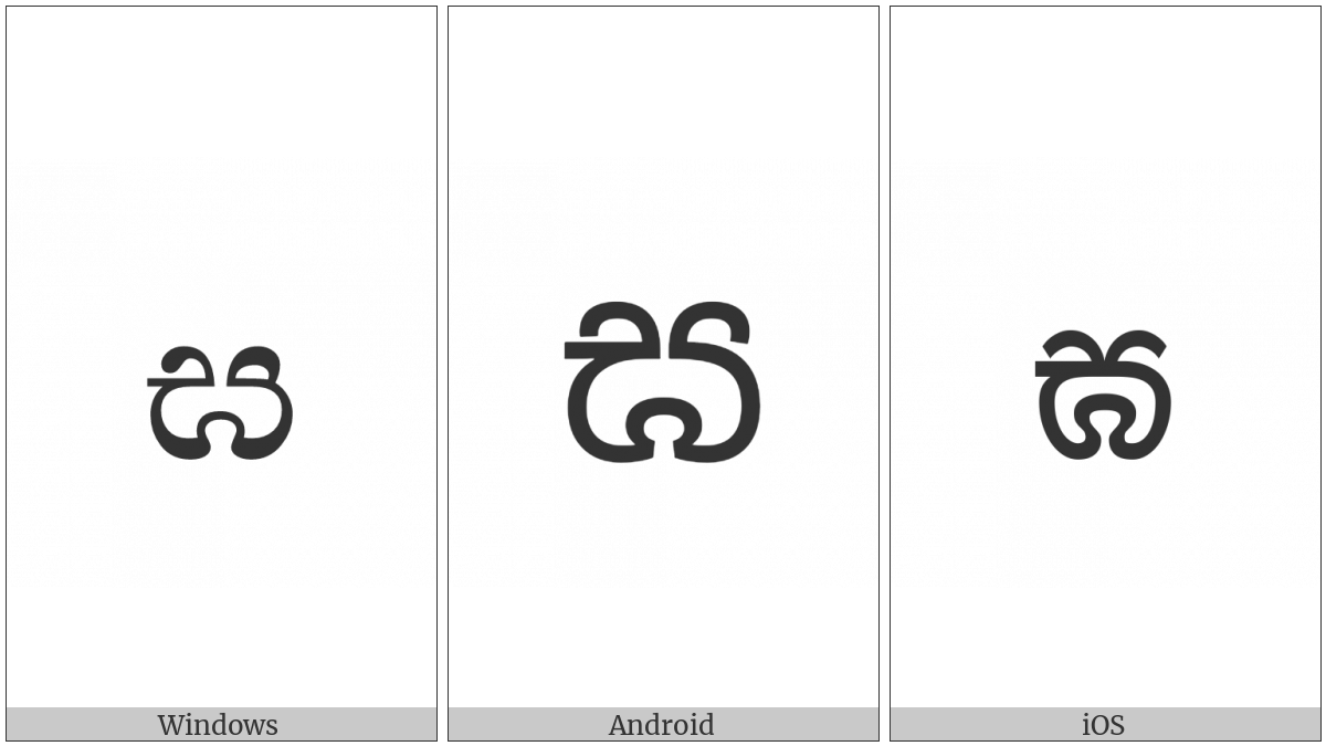 The image below shows how the “Sinhala Letter Mahaapraana Gayanna” symbol might look like on different operating systems. If the font in which this web site is displayed does not contain the symbol and there is no fallback font able to render it, you can use the image below to get an idea of what it should look like.