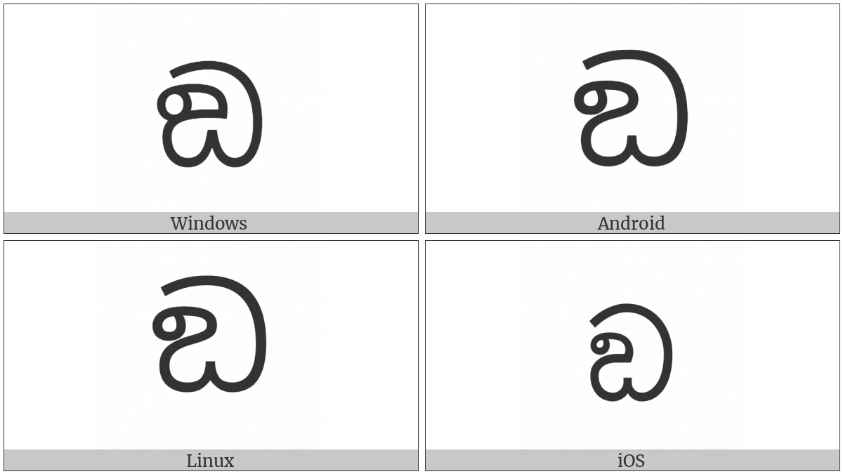 The image below shows how the “Sinhala Letter Kantaja Naasikyaya” symbol might look like on different operating systems. If the font in which this web site is displayed does not contain the symbol and there is no fallback font able to render it, you can use the image below to get an idea of what it should look like.