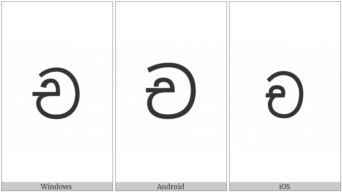 The image below shows how the “Sinhala Letter Alpapraana Cayanna” symbol might look like on different operating systems. If the font in which this web site is displayed does not contain the symbol and there is no fallback font able to render it, you can use the image below to get an idea of what it should look like.