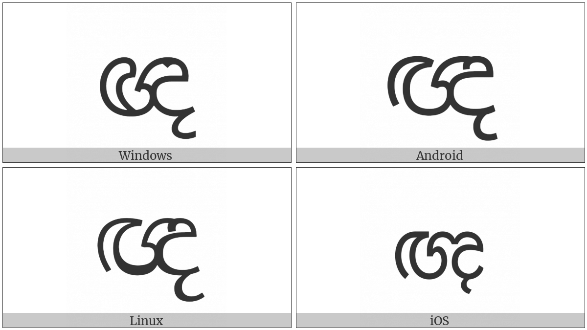 The image below shows how the “Sinhala Letter Taaluja Sanyooga Naaksikyaya” symbol might look like on different operating systems. If the font in which this web site is displayed does not contain the symbol and there is no fallback font able to render it, you can use the image below to get an idea of what it should look like.