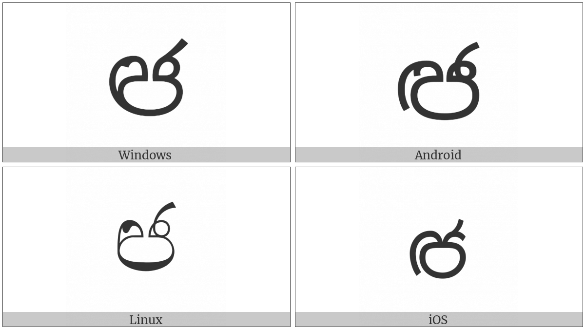 The image below shows how the “Sinhala Letter Sanyaka Jayanna” symbol might look like on different operating systems. If the font in which this web site is displayed does not contain the symbol and there is no fallback font able to render it, you can use the image below to get an idea of what it should look like.