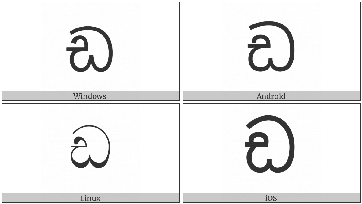 The image below shows how the “Sinhala Letter Alpapraana Ddayanna” symbol might look like on different operating systems. If the font in which this web site is displayed does not contain the symbol and there is no fallback font able to render it, you can use the image below to get an idea of what it should look like.