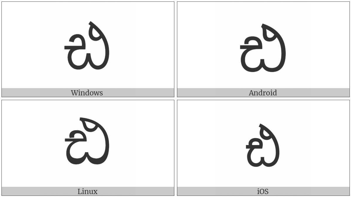 The image below shows how the “Sinhala Letter Mahaapraana Ddayanna” symbol might look like on different operating systems. If the font in which this web site is displayed does not contain the symbol and there is no fallback font able to render it, you can use the image below to get an idea of what it should look like.