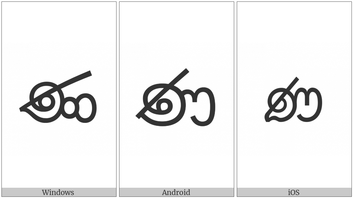 The image below shows how the “Sinhala Letter Muurdhaja Nayanna” symbol might look like on different operating systems. If the font in which this web site is displayed does not contain the symbol and there is no fallback font able to render it, you can use the image below to get an idea of what it should look like.