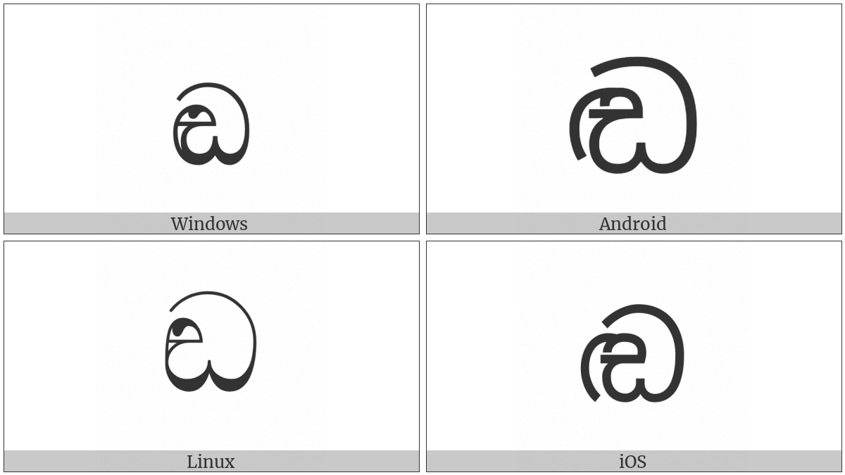 The image below shows how the “Sinhala Letter Sanyaka Ddayanna” symbol might look like on different operating systems. If the font in which this web site is displayed does not contain the symbol and there is no fallback font able to render it, you can use the image below to get an idea of what it should look like.