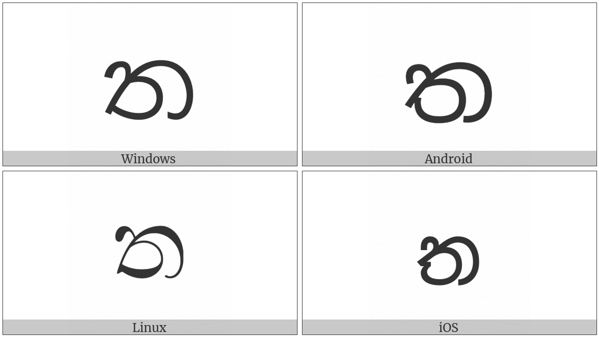 The image below shows how the “Sinhala Letter Alpapraana Tayanna” symbol might look like on different operating systems. If the font in which this web site is displayed does not contain the symbol and there is no fallback font able to render it, you can use the image below to get an idea of what it should look like.