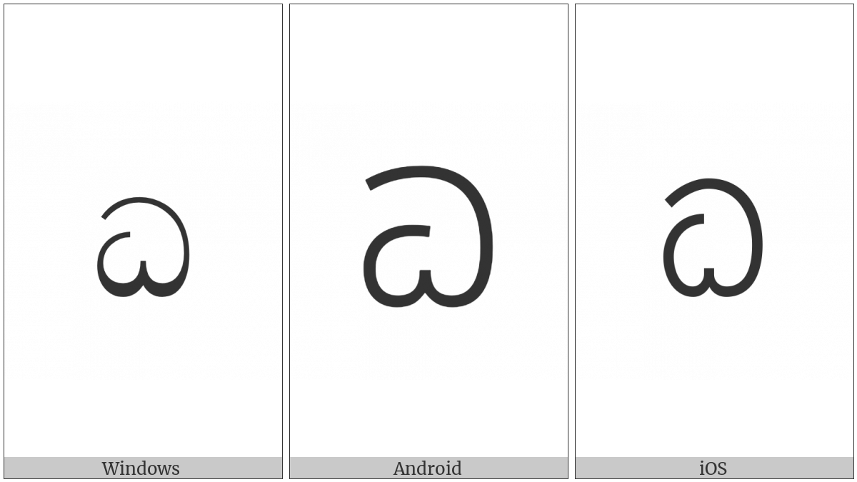 The image below shows how the “Sinhala Letter Mahaapraana Dayanna” symbol might look like on different operating systems. If the font in which this web site is displayed does not contain the symbol and there is no fallback font able to render it, you can use the image below to get an idea of what it should look like.