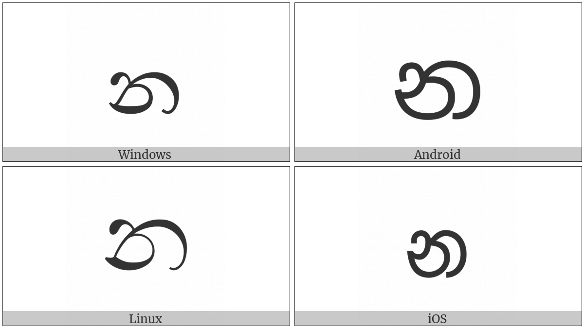 The image below shows how the “Sinhala Letter Dantaja Nayanna” symbol might look like on different operating systems. If the font in which this web site is displayed does not contain the symbol and there is no fallback font able to render it, you can use the image below to get an idea of what it should look like.