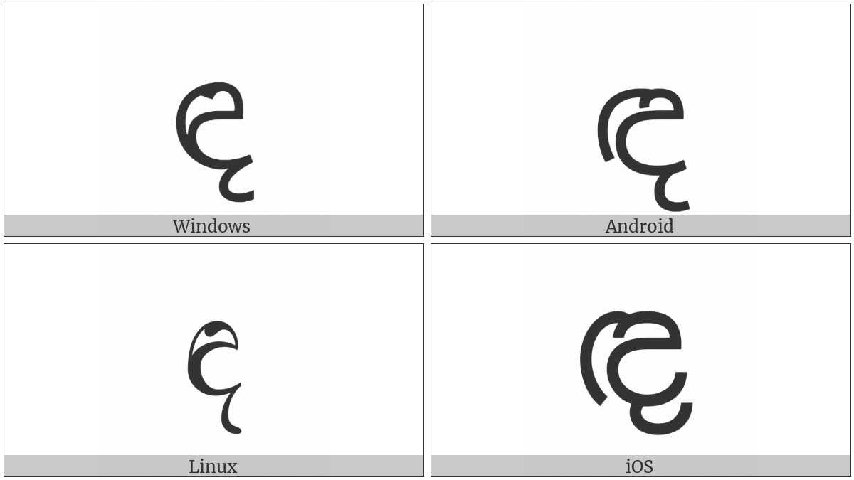 The image below shows how the “Sinhala Letter Sanyaka Dayanna” symbol might look like on different operating systems. If the font in which this web site is displayed does not contain the symbol and there is no fallback font able to render it, you can use the image below to get an idea of what it should look like.
