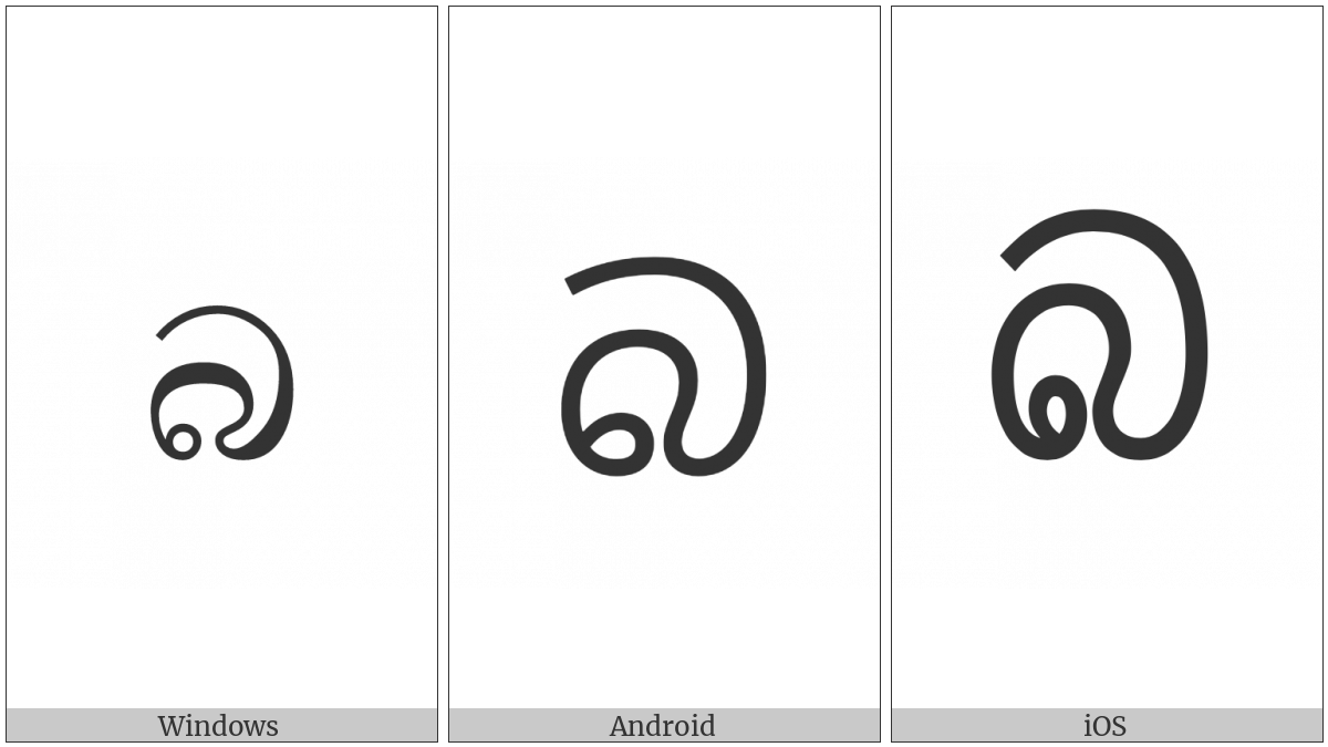 The image below shows how the “Sinhala Letter Alpapraana Bayanna” symbol might look like on different operating systems. If the font in which this web site is displayed does not contain the symbol and there is no fallback font able to render it, you can use the image below to get an idea of what it should look like.