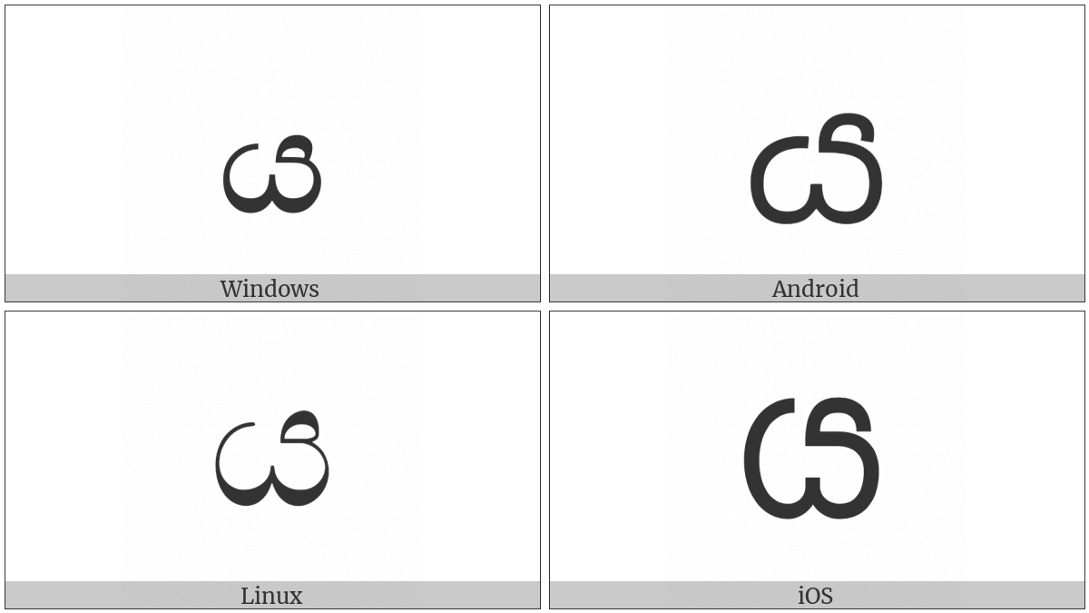 The image below shows how the “Sinhala Letter Yayanna” symbol might look like on different operating systems. If the font in which this web site is displayed does not contain the symbol and there is no fallback font able to render it, you can use the image below to get an idea of what it should look like.