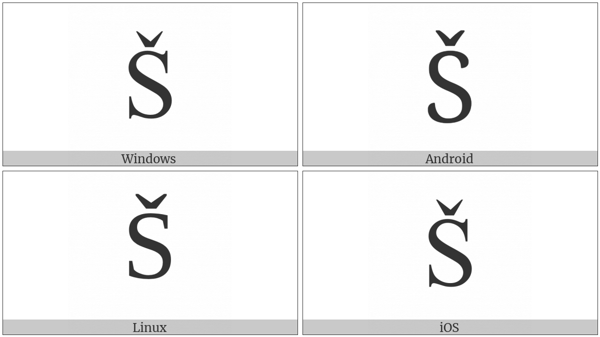 The image below shows how the “Latin Capital Letter S With Caron” symbol might look like on different operating systems. If the font in which this web site is displayed does not contain the symbol and there is no fallback font able to render it, you can use the image below to get an idea of what it should look like.