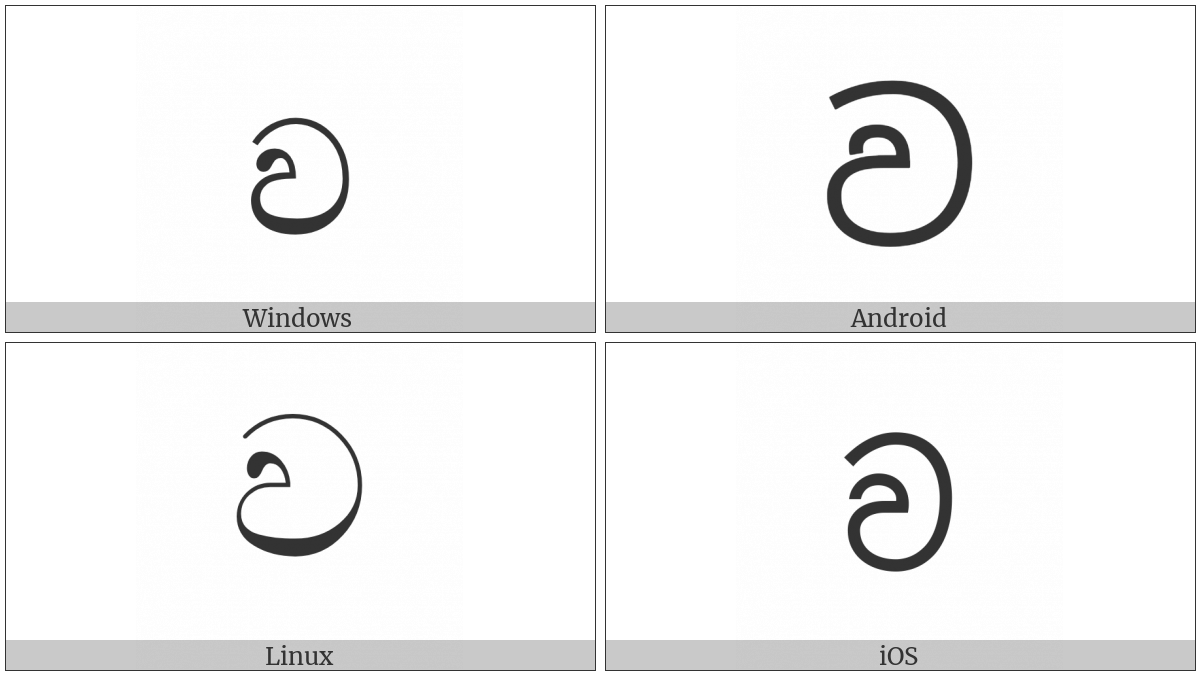 The image below shows how the “Sinhala Letter Vayanna” symbol might look like on different operating systems. If the font in which this web site is displayed does not contain the symbol and there is no fallback font able to render it, you can use the image below to get an idea of what it should look like.