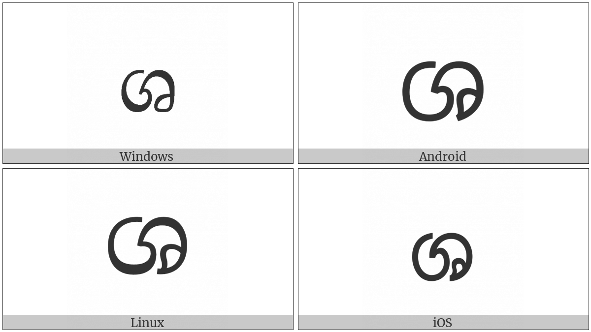The image below shows how the “Sinhala Letter Taaluja Sayanna” symbol might look like on different operating systems. If the font in which this web site is displayed does not contain the symbol and there is no fallback font able to render it, you can use the image below to get an idea of what it should look like.