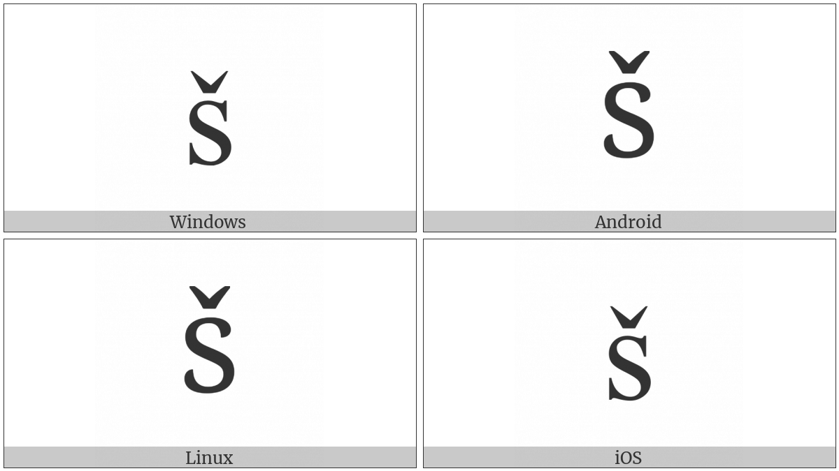 The image below shows how the “Latin Small Letter S With Caron” symbol might look like on different operating systems. If the font in which this web site is displayed does not contain the symbol and there is no fallback font able to render it, you can use the image below to get an idea of what it should look like.