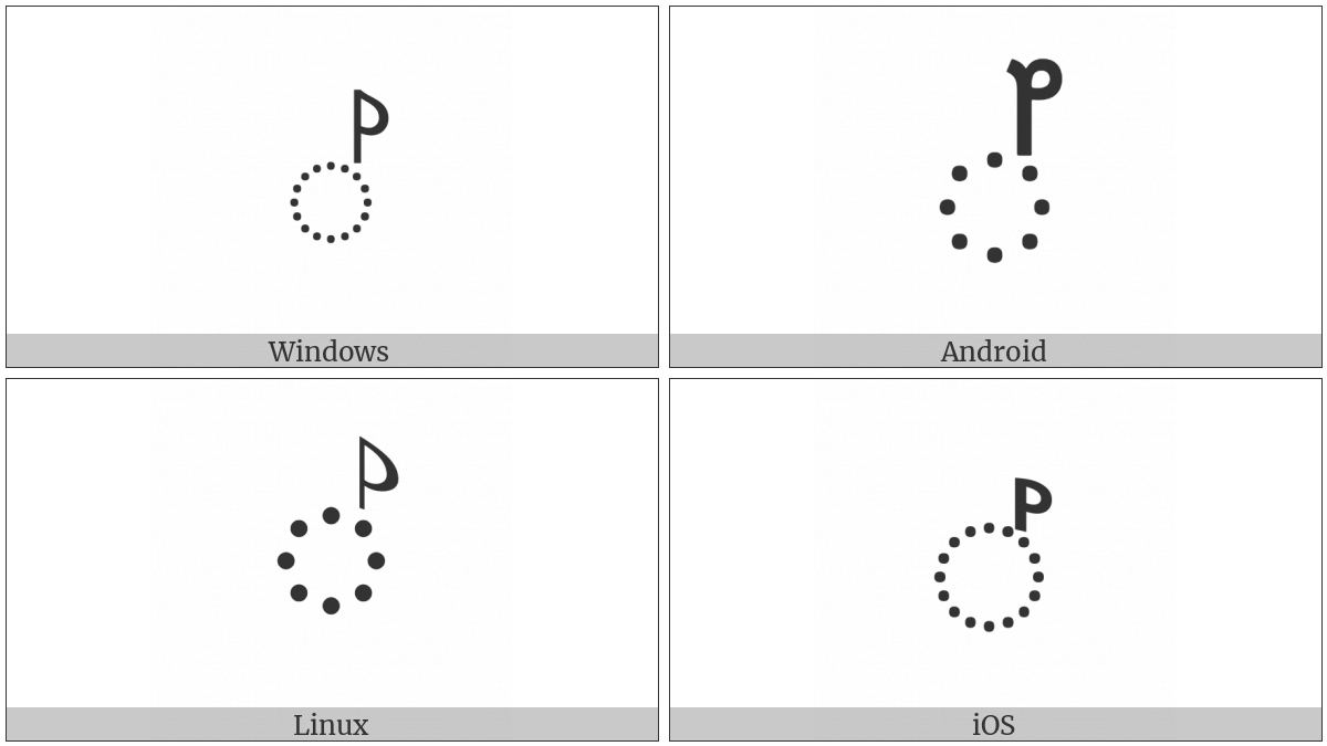 The image below shows how the “Sinhala Sign Al-Lakuna” symbol might look like on different operating systems. If the font in which this web site is displayed does not contain the symbol and there is no fallback font able to render it, you can use the image below to get an idea of what it should look like.