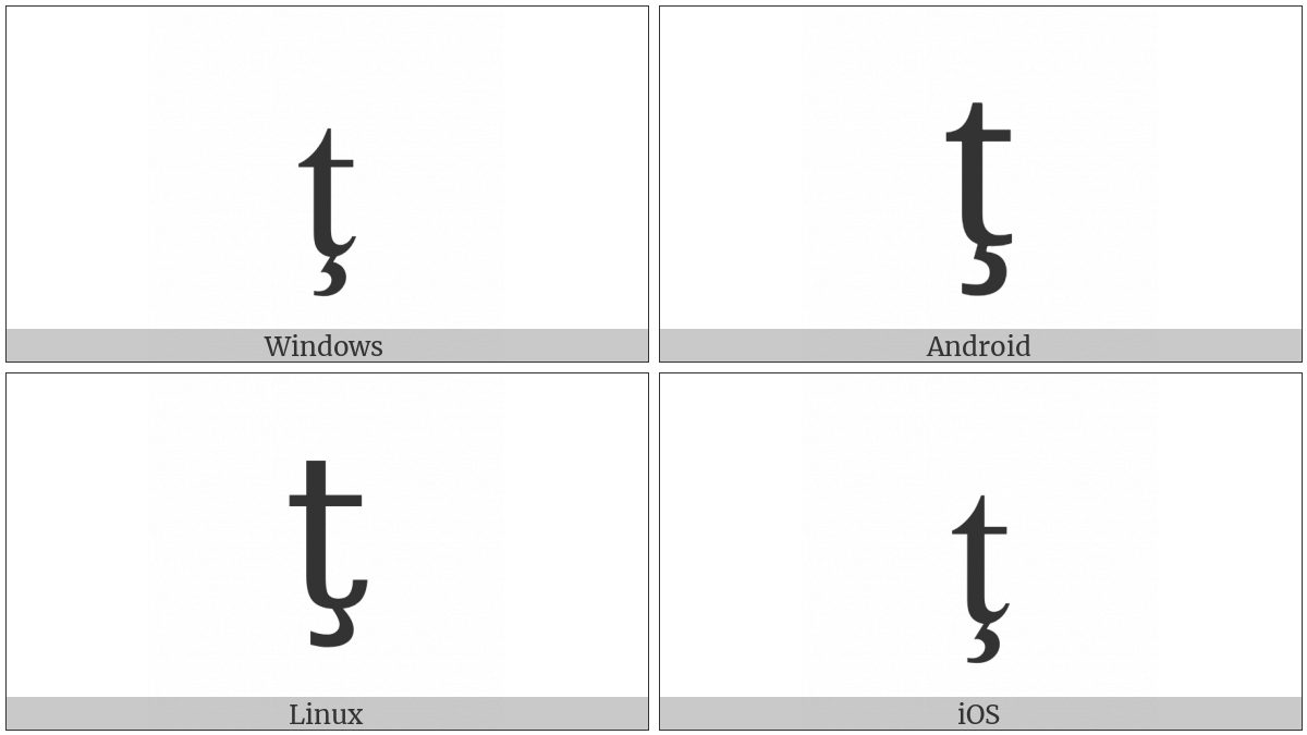 The image below shows how the “Latin Small Letter T With Cedilla” symbol might look like on different operating systems. If the font in which this web site is displayed does not contain the symbol and there is no fallback font able to render it, you can use the image below to get an idea of what it should look like.