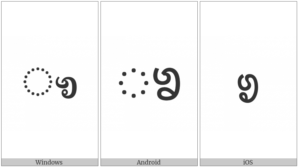 The image below shows how the “Sinhala Vowel Sign Diga Gayanukitta” symbol might look like on different operating systems. If the font in which this web site is displayed does not contain the symbol and there is no fallback font able to render it, you can use the image below to get an idea of what it should look like.