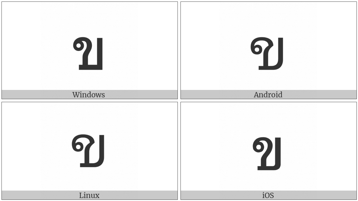 The image below shows how the “Thai Character Kho Khai” symbol might look like on different operating systems. If the font in which this web site is displayed does not contain the symbol and there is no fallback font able to render it, you can use the image below to get an idea of what it should look like.